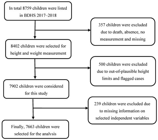 In BDHS 2017–2018 [7], multistage stratified sampling technique was used to collect the data. At the first stage, the BDHS selected a total of 672 primary sampling units (PSUs) (192 PSUs from urban and 480 PSUs from rural) from 293,579 PSUs (according to the national census 2011) using probability proportional to enumeration area (EA) size. In the second stage, 20,160 households were selected for data collection with 30 households from each selected PSU using an equal probability systematic sampling technique. This multistage sampling technique, including its sampling weight, helps reduce potential sampling bias. In the BDHS data, sample weights were calculated in each sampling stage, and each cluster and stratum were considered that had been adjusted for non-response to obtain the final standard weights. In addition, all ever-married women aged 15–49 years with children aged less than 5 years from the preselected households were interviewed without replacement and change in the implementing stage to prevent selection bias. Women verbal consent were taken for collecting children’s data, including demography, health, and nutrition. A total of 8759 children under-five were listed, and a further 7663 children were selected for analysis after excluding missing information (Figure 1).
