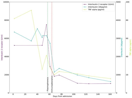 Figure 1. Longitudinal course of inflammatory cytokines. Serum concentrations of inflammatory cytokines TNF-alpha Tumor necrosis factor (TNF-alpha, light green), interleukin-2 receptor (IL-2 receptor, purple) and interleukin 18 (IL-18, dark green) are shown over time. Time of surveillance for this patient was from June 2021–January 2022. Time points of plasmapheresis and immunoadsorption are depicted in green or red dotted vertical lines, respectively.
