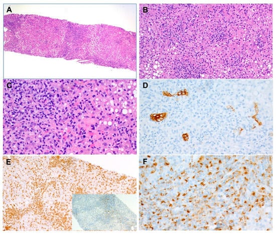 Figure 2. Liver histology. (A) Overview showing highly cellular portal and lobular inflammatory infiltrate. Note: prominent steatosis (metabolic dysfunction-associated fatty liver disease, MAFLD) (×50). (B) Higher magnification of the lobular inflammation (×100). (C) Higher magnification of the portal inflammation (×200). (D) CK7 immunostain highlighting destroyed and atrophic bile ductile epithelium (×200). (E) Main image: extensive CD3 positive lymphocytes. Sub-image: very sparse CD20-positive B-lymphocytes (×100). (F) Prominent CD68-positive macrophages (×200).