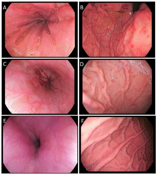 Figure 3. Endoscopic findings of esophagus (left) and gastric corpus (right) at decision of initiating plasmapheresis and immunoadsorption (A,B). Two months later (C,D), an amelioration of the esophageal ulcera and gastric erosions could be observed. Mucosal healing was documented 9 months later (E,F).