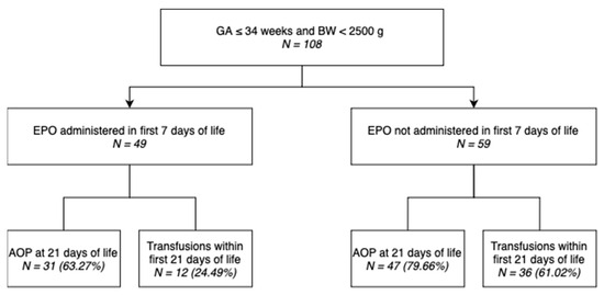 This study includes 108 neonates admitted to the Neonatology and Preterm Department of the “Louis Turcanu” Children’s Emergency Clinical Hospital in Timisoara, Romania during October 2021 and December 2022. The inclusion criteria included GA under 34 weeks and BW under 2500 g. The exclusion criteria included congenital cardiac, neurological and renal malformations; genetic syndromes; congenital infections; and individual or family hematological diseases, such as hemolytic anemia due to group and Rh isoimmunization, microspherocytosis, and thalassemia. The GA was estimated using the last menstrual period. Birth weight (BW), alongside 1 and 5 min Apgar scores, were measured during the first postnatal minutes. Prothrombin Time (PT) and activated Partial Thromboplastin Time (aPTT) were measured during the first day of life in order to analyze a potential correlation to AOP or one of its stages. Lactate dehydrogenase (LDH) levels were measured within the first six postnatal hours. Hb, HCT, RBC, and serum EPO levels were measured at 1, 7, and 21 days of life. Given that the administration of prophylactic rhEPO is very important for neonates with low serum EPO levels, randomization could not be performed, and the intervention was performed in neonates who presented EPO levels under 4.3 mUI/mL on the first of life. Therefore, the intervention group consisted of 49 neonates that were administered rhEPO-beta prophylactically subcutaneously at a dose of 500 U/kg BW at 2, 4, 7, 14, 21, and 28 days of life and, if required, they also received RBC transfusions. The remaining 59 neonates that were not administered rhEPO formed the control group. According to the literature, the guidelines regarding RBC transfusions for preterm neonates are controversial, with administration strategies varying greatly [20,21]. Due to such variations in administration protocols, the lack of a national guideline, and patients being admitted for up to one month, with rare cases in which the duration of hospitalization exceeds this period, rhEPO treatment was carried out according to the protocol of the “Louis Turcanu” Children’s Emergency Clinical Hospital. Iron was administered at a dose of 5 mg/kg BW/day, taking various factors into consideration, including breastfeeding versus formula, to prevent iron deficiency. Approval was granted on 5 October 2023 by the Ethics Committee for Scientific Research and Development of the “Louis Turcanu” Children’s Emergency Clinical Hospital Timișoara with approval protocol code number 84.