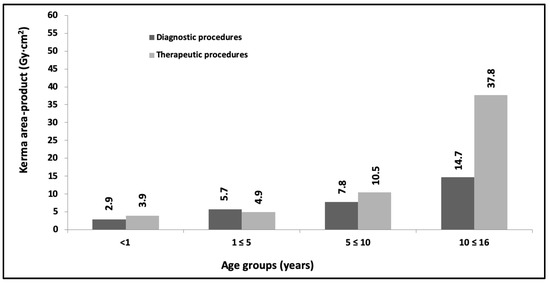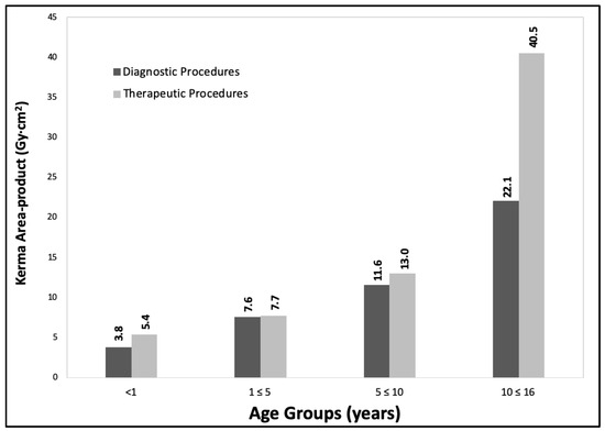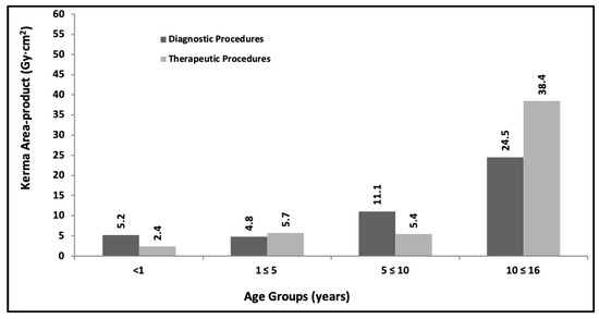Regarding the collection of patient dose data and the proposal of initial DRLs, Figure 2 shows a summary of third quartile values for kerma area-product for 128 procedures collected during 2020, of which 63 were diagnostic and 65 were therapeutic, grouped by age ranges (<1 year; 1 ≤ 5 years; 5 ≤ 10 years and 10 ≤ 15 years).