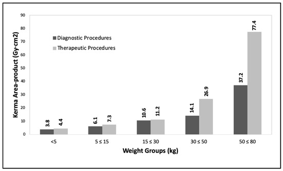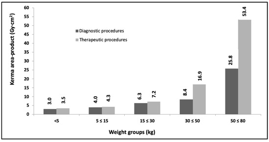 Figure 3 and Figure 4 show the DRLs grouped (third quartile values for kerma area-product) for the same age ranges as the previous year and weight ranges (<5 kg; 5 ≤ 15 kg; 15 ≤ 30 kg; 30 ≤ 50 kg and 50 ≤ 80 kg) for the year 2021, which corresponded to 968 procedures (268 diagnostic and 427 therapeutic).