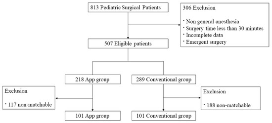 The current study is an observational retrospective matched cohort single-center study. During the study periods, we retrieved 813 cases of pediatric anesthesia. After applying the exclusion criteria (non-general anesthesia, short surgery time, incomplete data, or emergent surgery), 507 cases were still eligible. After matching for the duration of anesthesia, nurse working years, and patient age, there were 101 cases in the App group and 101 in the Conventional group (