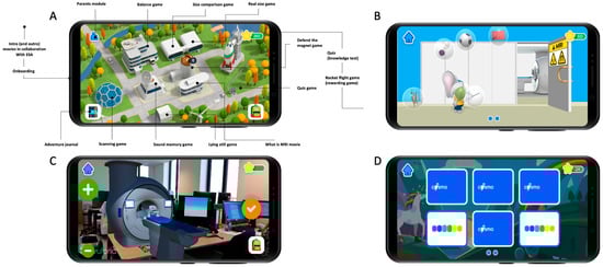 App design and look. (A) Overview of the space campus with all the buildings and minigames. (B) Screenshot of the “Defend the magnet” minigame, where children have to prevent metal objects from flying into the MRI room by tapping on them. (C) “Real size game”. Using augmented reality, children can project the MRI scanner in their room and scale it until they think it is “real-sized”. (D) “Sound memory game” minigame, where children need to pair the same MRI sounds by simultaneously turning two identical sound cards.