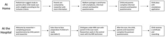 Eligible children and their parents were introduced to this study (Figure 2), and if consent was obtained, a welcome package containing the smartphone with the COSMO@HOME app, an information folder, props for minigames, and a baseline questionnaire was sent to their homes. Both parents and children provided written consent and completed the baseline questionnaires before using the app. On the day of the scheduled MRI scan, parents brought the signed consent, completed questionnaires, smartphone, and props to the appointment. The children and parents were greeted by an experienced child specialist who conducted a standardized welcome interview. Pre-scan questionnaires, a mini-quiz in the app, and observations by the researcher were used to determine whether a child required additional face-to-face preparation or could proceed directly to the scan. The criteria for proceeding without additional preparation are outlined in Table 2. If additional preparation was needed, it was provided for critical points before the child was permitted to undergo the scan.