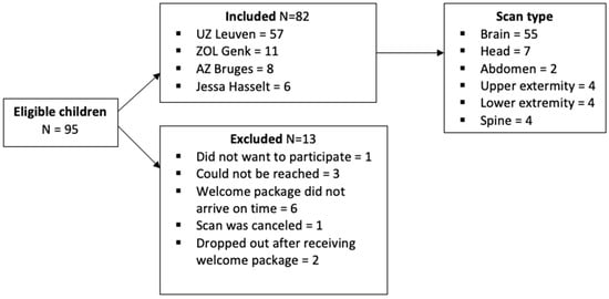 A total of 95 children were found eligible by the prescribing pediatrician, but 13 were excluded for various reasons (Figure 3). The main descriptive results of the 82 included children are displayed in Table 3. Of those who had a previous MRI experience, only 12 (average age: 6.1, SD = 12.3, and range = 6–10 years) had an MRI scan without sedation or anesthesia. None of these children had previously received the COSMO protocol as preparation.