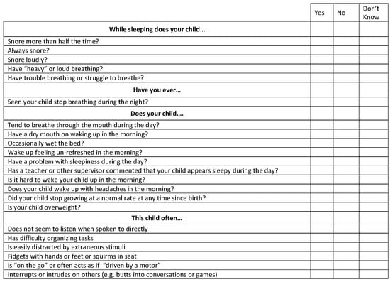 - Chervin, R.D.; Weatherly, R.A.; Garetz, S.L.; Ruzicka, D.L.; Giordani, B.J.; Hodges, E.K.; Guire, K.E. Pediatric Sleep Questionnaire: Prediction of Sleep Apnea and Outcomes. Arch. Otolaryngol. Head Neck Surg. 2007, 133, 216–222. [Google Scholar] [CrossRef]