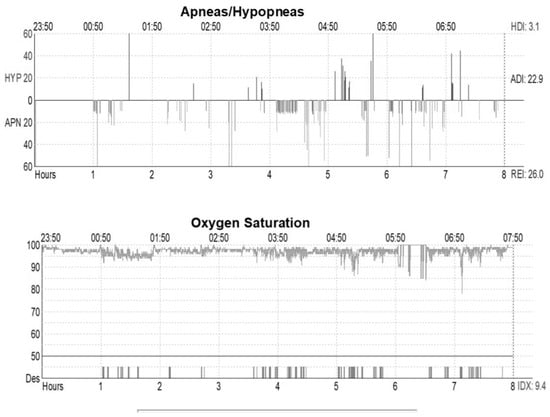 Nocturnal Home Cardiorespiratory Polygraphy report. ADI, apneas per hour of sleep; APN, apnea; Des, desaturation; HDI, hypopneas per hour of sleep; HYP, hypopnea; IDX, oxygen desaturation index; and REI, respiratory event index.