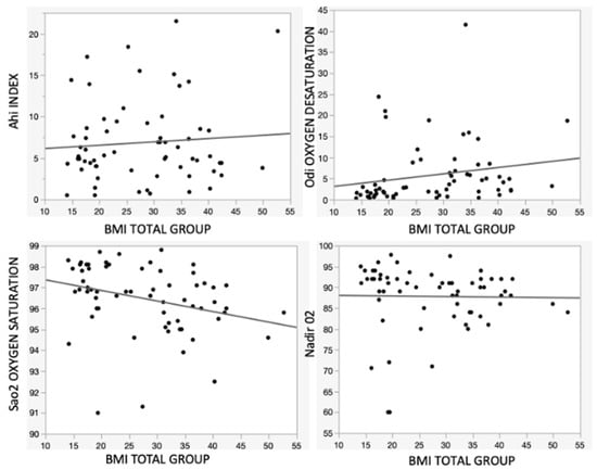 Conversely, in our study, the Obese Group exhibited a higher value of the AHI, but its difference with the Control Group’s AHI value was not statistically significant. This finding is similar to the study by Su et al., in which a very large sample of children with OSAS with and without obesity was analyzed, reporting an AHI value that was not statistically significant [23]. Then, the comparative analysis of the different respiratory parameters was conducted, and we reported a lower oxygen saturation, a higher ODI value, and a lower Nadir O2 value for the Obesity Group than the Control Group, but only the ODI showed a statistically significant difference. The study of Andersen et al. was very similar to ours, and they reported a non-statistically significant difference in both SaO2 and ODI [4]. Conversely, our study showed a statistically significant ODI; this means that the obese group presented several episodes of desaturation below 4%, indicating the importance of monitoring saturation and its decrease in obese children. Furthermore, we conducted a correlation analysis to verify the value of the respiratory parameters, according to the increase in BMI.