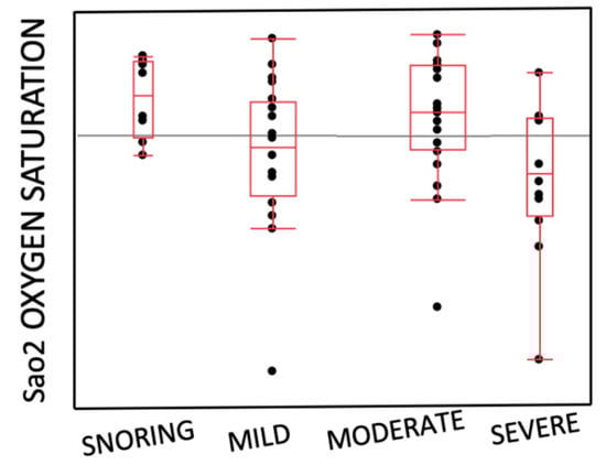 The box and whiskers plot (Figure 4) reported the SaO2 distribution in the different OSAS severity categories. The graph presented a horizontal line corresponding to a saturation of 97, the average oxygen saturation value in a healthy subject. As shown in the diagram, the box and the corresponding median of snoring was positioned above the value of 97, and its lower dispersion index was just below the normal value. The mild OSAS reported a SaO2 below the median, but very close to the normal oxygen saturation value. Unlike the mild form, in the severe OSAS, the saturation of oxygen was reported to be below the median, but with a lower dispersion index far below the value of 97. Finally, in the moderate form of OSAS, the median was placed above the value 97, but its dispersion index was very far from the normal saturation.