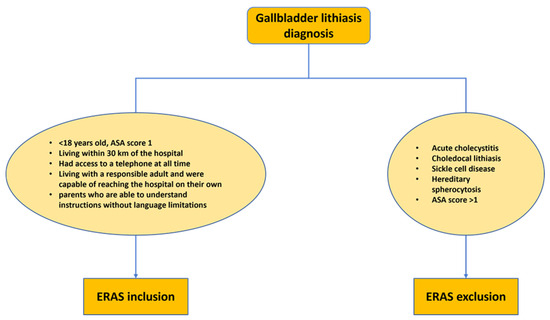ERAS cholecystectomy was performed for uncomplicated lithiasis, focusing on the highest and relatively more straightforward volume cases to facilitate the hepatobiliary learning curve in pediatric surgery.