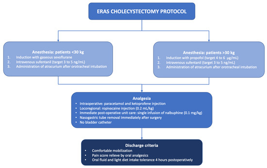 - Yeh, A.; Butler, G.; Strotmeyer, S.; Austin, K.; Visoiu, M.; Cladis, F.; Malek, M. ERAS protocol for pediatric laparoscopic cholecystectomy promotes safe and early discharge. J. Pediatr. Surg. 2020, 55, 96–100. [Google Scholar] [CrossRef] [PubMed]