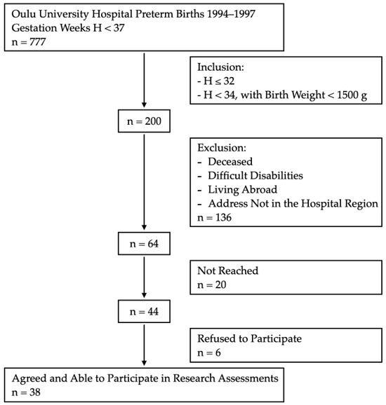 The preterm-born participants for this study were selected from infants treated at the Oulu University Hospital between 1994 and 1997. These participants were identified using hospital records. Healthy young adults born either before 34 weeks’ gestation with very low birth weight (VLBW, <1500 g) or at ≤32 weeks’ gestation met the inclusion criteria. From this population, those who were deceased; living abroad or outside the tertiary hospital district; and with complex physical, intellectual, or social disabilities that would have prevented the planned investigations were excluded from this study. A more detailed flow chart of the participant recruitment is presented in Figure 1.