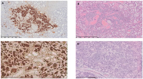 Following the ATA (American Thyroid Association) and Polish national recommendations [8,9], the patient was immediately admitted to the surgery department for total thyroidectomy with lymphadenectomy of the middle compartment and biopsy of lymph nodes of the lateral compartments. Histological examination of the thyroid gland showed two cancer foci measuring 2 mm in the left lobe and 2.2 mm in the right lobe, corresponding to MTC (low grade) (Figure 2). No vascular invasion was found, and the surgical margins were negative. Immunohistochemical expression of MTC marker—calcitonin was positive in the cancer cells. No metastatic structure was found in the assessed lymph nodes. The parathyroid glands and thymus tissue were without neoplastic infiltration.