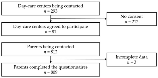 The recruitment of parents was conducted in day-care centers in two federal states in Germany (Hamburg and Schleswig-Holstein) between January and October 2021. The inclusion of data from two German federal states, covering both rural and urban day-care centers, was intended to improve the generalizability of the findings. The completed questionnaires were received until 31 January 2022. In total, 293 day-care centers were contacted and informed about the study by mail. Of those, 81 agreed to participate in the survey, and they subsequently received quarterly questionnaire packets and consent forms. These were distributed by the educators to parents of preschool children. The only inclusion criteria to participate in the survey were to be a parent of a preschool child and to have sufficient language skills in German to answer the questionnaire. In total, 812 participants were screened. Due to missing data, 809 questionnaires could be finally included in the statistical analyses. The study design and procedures are shown in Figure 1.