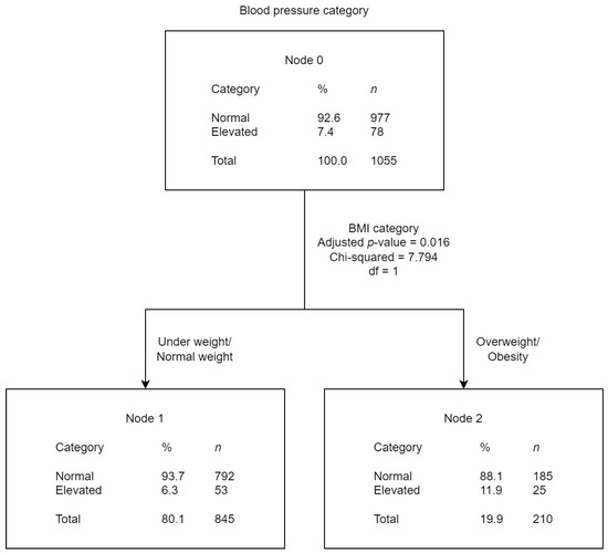 The CHAID analysis showed that (Figure 2), “BMI category” was the independent variable that best explained BP categorization (p = 0.016). The classification accuracy for this model was 95.1% (p = 0.008), meaning that with the divisions established by the model for the independent variable (“BMI category”), individuals would be classified in their correct BP category 95/100 times. Accordingly, the percentage of EBP was found to be higher in students within the obese BMI category.