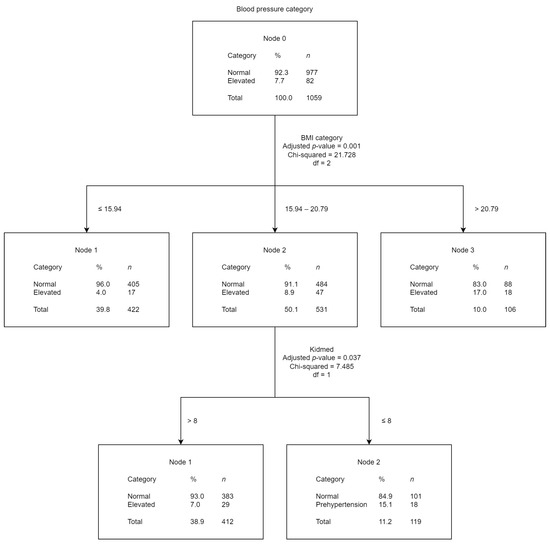 Figure 3. Blood pressure category CHAID analysis with BMI and Kidmed score as the independent variables.
