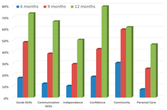The targets were chosen in conjunction with each family involved in the project and these were reviewed at six months, nine months and 12 months (prior to families leaving the project). For each target, a judgement on the child’s progress was made by the parents and project staff using a five-point scale from ‘much better’; ‘better’; ‘the same’; ‘worse’ and ‘much worse’. In order to condense the information relating to the 110 children, the chosen targets were grouped into six domains and within each domain, the number of children whose progress was assessed as ‘much better’ could be ascertained. The number of children varied across domains and once a learning target had been achieved, new targets could be selected for children during the 6–12 month period. Hence, the numbers for whom the targets in each domain were selected may have been made up of different children at each time points. Nonetheless, this approach provides a synthesis of trends across the total sample of children.