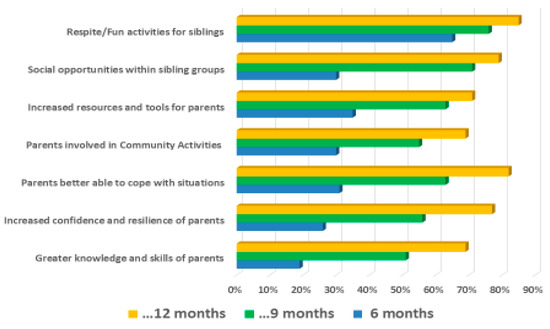 The number of social activities parents engaged in was rechecked at the end of their time with the project (see Section 2.3). For parents who participated in the project pre-COVID-19, there was a small but significant increase in the mean number of activities they participated in monthly (from mean of 1.34 to 2.18: Paired t-tests: p < 0.05); however, during COVID-19, no difference was reported (mean 1.18 before and 1.04 after).