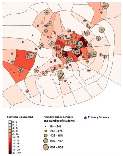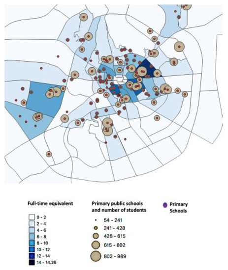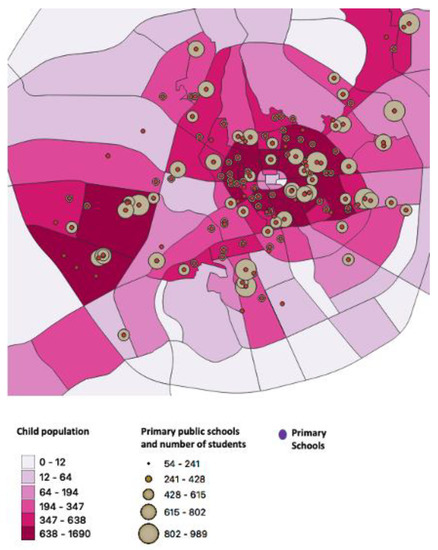 The distribution of the primary schools with the student population and the child population in Al-Madinah city is presented in Figure 1. The size of the circle reflects the student population size at each respective school. The child population density per district is presented as a gradient, the higher density, the higher the child population size per district. The child population per district ranges from 16,902—5 children per district and the student population per school ranges from 989—54 students per school.