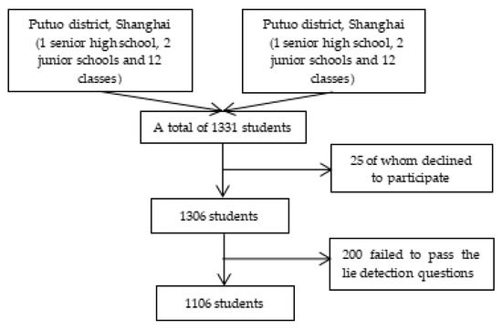 In November 2019, we conducted a cross-sectional study in Putuo district, Shanghai and Datong City, Shanxi province. Middle and high school students aged 12–18 were surveyed. Classes were chosen as the sampling unit, and the sampling method comprised multistage, stratified and cluster sampling. Three stages in the sampling process were as follows: (i) for each city, three middle schools, including one senior high school and two junior schools, were selected (six schools in total); (ii) for each school, 4 classes were randomly selected (24 classes in total); (iii) all the students in the selected classes were surveyed. Before the survey, we sent out passive consent letters to the parents or guardians of all subjects via their schools. The parents or guardians were required to return a signed form if they did not want their child to participate in the survey. Then, we obtained active consent from the subjects, including asking whether they agreed to participate voluntarily at the very beginning. A total of 1331 people was surveyed, 25 of whom declined to participate, leading to a response rate of 98.12%. We also conducted data quality control. For instance, 200 of the 1306 people surveyed failed to pass the lie detection questions in the later stage. In the adolescent psychosexual health scale, there are 4 pairs of polygraph questions in the design. If three pairs or more responses were inconsistent, we excluded them when analyzing the data. Thus, the final analysis ended up with 1106 subjects with a passing rate of 84.68%. As shown in Figure 1.