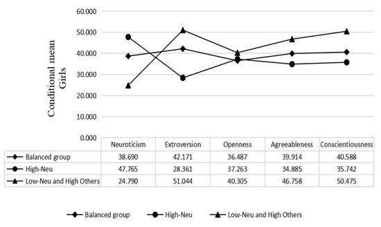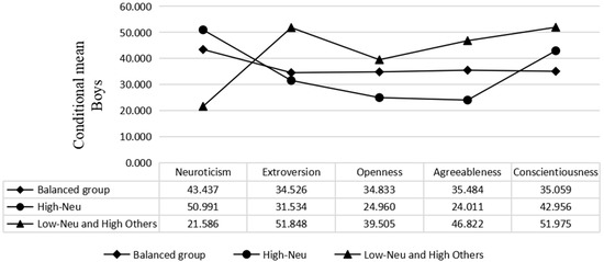 Based on the results of the latent profile analysis, students of both male and female genders were divided into three categories according to their personality characteristics. The results of boys and girls were similar. As shown in Figure 2 and Figure 3, the first category was relatively balanced in neuroticism, extroversion, openness, agreeableness and conscientiousness, and was named the balanced group. The second category of subjects had higher neuroticism scores than the other groups, and was called the high-neuroticism group. The third category of subjects had lower neuroticism scores, but the other features were higher; we named this the low-neuroticism and high-others group. Among boys, there were 116 (22.35%) in the first category, 281 (54.14%) in the second category and 122 (23.51%) in the third category. There were 355 (60.48%) girls in the first category, 66 girls (11.24%) in the second category and 166 (28.28%) girls in the third category.