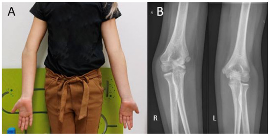 (A) Visual inspection of the carrying angle of the elbow in a 10-year-old girl showing a unilateral cubitus varus on the right side. (B) Anteroposterior radiographic views of the elbow with the unaffected contralateral side for comparison.