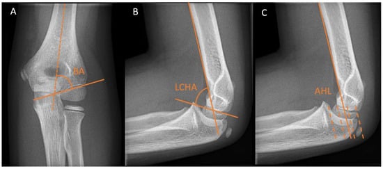 - Shank, C.F.; Wiater, B.P.; Pace, J.L.; Jinguji, T.M.; Schmale, G.A.; Bittner, R.C.; Bompadre, V.; Stults, J.; Krenger, W.F. The lateral capitellohumeral angle in normal children: Mean, variation, and reliability in comparison to Baumann’s angle. J. Pediatr. Orthop. 2011, 31, 266–271. [Google Scholar] [CrossRef] [PubMed]