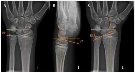 Distal radius radiographic reference lines. (A) Radial height (RH). (B) Volar tilt (VT). (C) Radial inclination (RI).