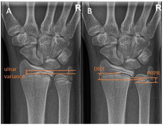 Distal ulna radiographic reference lines. (A) The Hafner method for measuring ulnar variance. (B) The method of perpendiculars for measuring ulnar variance, with ‘PRPR termed as the two most proximal points of the physis and ‘DIDI’ termed as the two most distal points of the physis.