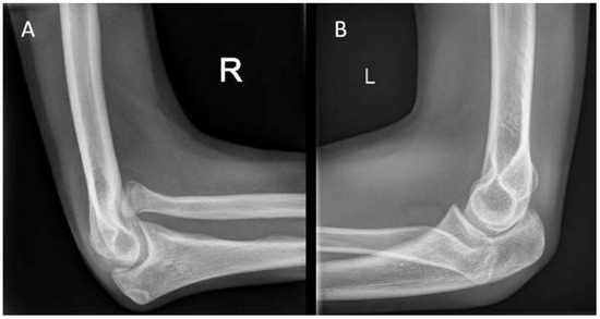 Proximal radial fractures represent up to 10% of all pediatric elbow fractures [29,30]. The mechanism of injury is usually a fall on an outstretched hand, combined with a compressive valgus force across the elbow joint. Despite the occurrence of these fractures around the growth plate, premature physeal closure occurs in about 1.5% of patients [30]. Growth has more impact, however, in congenital radial head dislocations (Figure 5). Although rare in absolute numbers, it is the most common congenital elbow abnormality, accounting for up to 10% [31]. Dislocations occur bilaterally in most cases. Around 70% of dislocations occur posteriorly, followed by anterior and lateral dislocations, occurring around 15% each [31]. With frequent dislocations, the normal anatomical relation of the radial head with the capitellum and the proximal radioulnar joint (PRUJ) during growth may be lost. Without the pressure of the radial head onto the capitellum during growth, a malformation of the radial head with loss of concavity occurs, making reduction in longstanding cases impossible [31]. Patients are generally presented with a painless mass at visual inspection or palpation. Elbow flexion may be slightly decreased in the case of an anterior dislocation, and extension may be slightly decreased in the case of a posterior dislocation. Additionally, DRUJ alignment may be lost, resulting in decreased ROM during pronation and supination [31]. A lateral elbow radiograph is often sufficient to diagnose this condition. Herein, the extent of radial head deformation is a reliable guideline in the decision of whether to operate on a patient [32]. If the radial head is more dome-shaped and has lost all its concavity, surgery tends to be unsuccessful.
