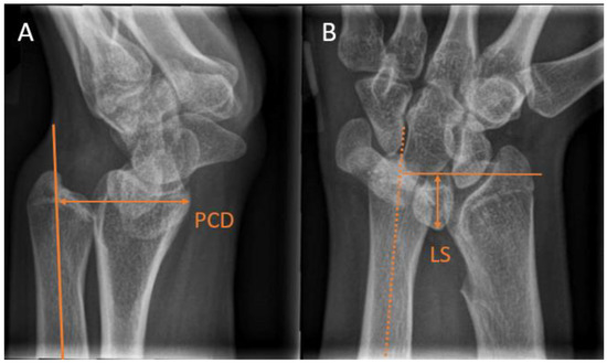 Madelung deformity is a rare congenital arm condition that affects the growth plate of the distal radius. The lagging growth of the distal radius results in a radioulnar and radiocarpal misalignment. The progressive growth disturbance may eventually lead to a three-dimensional wrist deformity [40]. Madelung deformity is usually diagnosed between the ages of 6 and 13 years [41]. In children with Madelung deformity, additional ulnar radiological measurements are indicated. Farr et al. [40] stated that in addition to ulnar variance, a lunate subsidence (LS) >4 mm and a palmar carpal displacement (PCD) >20 mm were radiographic criteria for undergoing an ulnar shortening osteotomy. They measured PCD on a lateral radiograph as the distance between the longitudinal ulna axis and the most volar aspect of the lunate (Figure 6A). LS was measured on a PA radiograph as the distance between a perpendicular line to the longitudinal ulna axis and the most proximal point of the lunate. (Figure 6B). Symptoms of Madelung deformity can range from wrist pain to decreased function. Most commonly, patients experience a limited range of motion in the wrist and continuous or post-activity wrist pain.