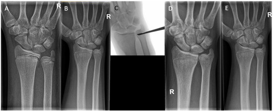 - Dario, P.; Matteo, G.; Carolina, C.; Marco, G.; Cristina, D.; Daniele, F.; Ferretti, A. Is it really necessary to restore radial anatomic parameters after distal radius fractures? Injury 2014, 45, S21–S26. [Google Scholar] [PubMed]