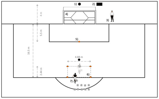 The test administrator records the results (3) and stands next to the goal so that a good view of both the speed display and the goal is ensured in order to record the results correctly. A cone 5.5 m from the goal line in a central position (5) serves as a marker for the maximum shot speed test. The shooting area from which the subjects have to take the target shots (6) is marked by four cones. It is 4.88 m wide and is located centrally in front of the goal at a distance of 14.06 m. The length is 2.44 m, which then places the cones far from the goal at a distance of 16.5 m from the goal line. Behind the shooting area, there is the starting position of the subjects (7). There, the normal game balls are ready—ideally eight of them, so that the subjects can perform their eight target shots without interruption.