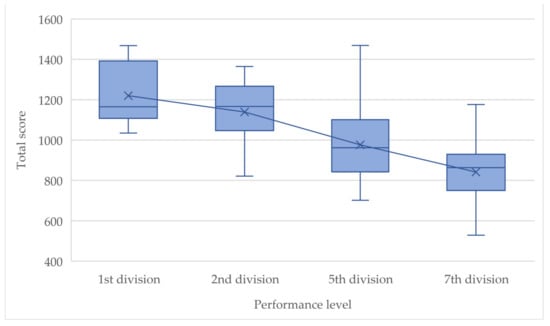 Figure 3 and Figure 4 show the ranges of the variables avg. shot speed NDL and total score in each case in relation to the performance level. The differences between the teams are recognizable and allow areas to be defined on which basis a subject can be assigned to a performance level based on his shot quality. The overlaps show that there are smooth transitions between players of different levels, e.g., it is possible that some players from a lower league achieve better results in the shot test than a player from a higher league and vice versa. The presented mean lines show a clear loss of value for both variables the lower the performance level of the team is. Only the differences in avg. shot speed NDL between the 1st division and the 2nd division are not very large. However, the difference in performance level between these two groups is, in fact, the smallest.