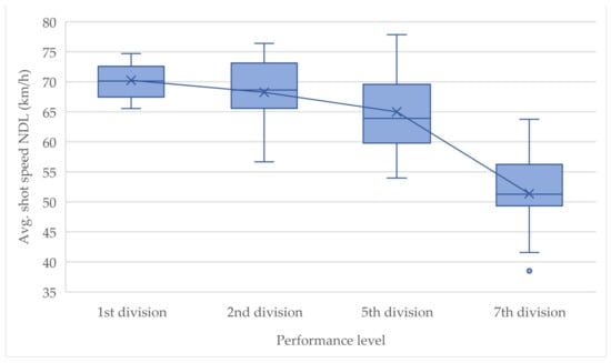 Studies by Ali et al. [21] and Keller et al. [22] showed that elite soccer players on average shoot harder than nonelite soccer players. Professional athletes reached an average speed of about 80 km/h in their studies. The average shooting speed of the highest performance group in our sample was 72 km/h. This difference can probably be attributed to the age of the participants—they analyzed adult soccer players in their studies, whereas junior soccer players were tested in our study.