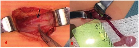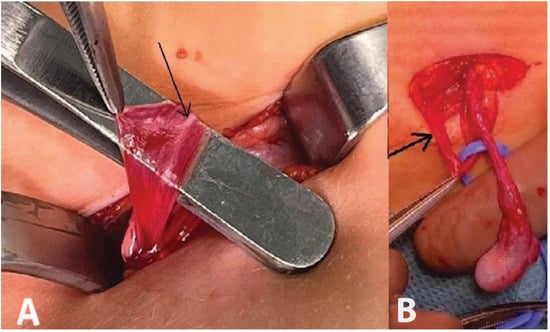 We opted for orchiopexy because the testicular vessels appeared to be sufficiently long. An incision was made in the left inguinal area to open the inguinal canal. Exploration of the inguinal canal revealed a blind-ending deferent duct (Figure 3A,B).