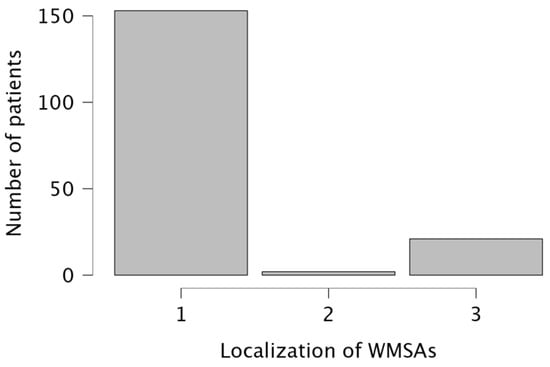 Distribution of WMSAs in the study cohort. 1 = supratentorial only; 2 = infratentorial only; 3 = combination of supra- and infratentorial WMSAs.