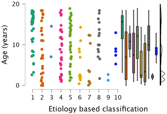 Statistical analysis was performed using JASP (Version 0.16.3) [16], an open-source statistics program, and BiAS, a commercial statistics program (Version 11.12, © 1989–2021, epsilon-Verlag, Frankfurt, Germany). The Kolmogorov–Smirnov Test [17] was used to determine whether the sample data were normally distributed. Since the sample data were not normally distributed, the Kruskal–Wallis test [17], a rank-based nonparametric test, was used to determine if there were statistically significant differences with regard to age and gender distribution between etiological groups 1–10. The null hypothesis was that there was no difference between etiological groups with regard to age and gender distribution. Since the Kruskal–Wallis null hypothesis was rejected with regard to age distribution, the Dunn’s test for stochastic dominance [18] was used to report the results among multiple pairwise comparisons. p-values were adjusted for multiple comparisons using the Holm–Bonferroni method. A p-value < 0.05 was considered to be statistically significant.