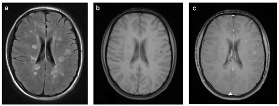 Representative case “Autoimmune disorders”: MS. FLAIR (a), T1W pre- and post-contrast (b,c) sequences. Fifteen-year-old girl diagnosed with MS. MRI shows characteristic ovoid/round lesions with asymmetric distribution abutting the lateral ventricles (periventricular) and touching the cortex (juxtacortical) [19] (a). Contrast-enhancing lesions in T1W post-contrast sequences are considered markers of blood–brain barrier breakdown (c).