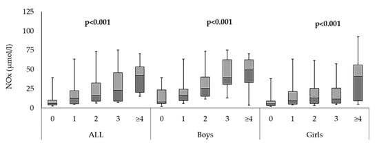 Comparison of serum NOx (µmol/L) levels and of clustering of MetS individual components in all participants, as well as in boys and girls.