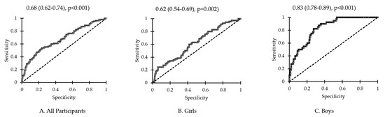 Lastly, ROC analysis was performed to assess whether NOx could be a reliable biomarker for pediatric MetS. The area under the curve (AUC) showed that NOx had good sensitivity for MetS diagnosis, and it was higher in boys than in girls ((all MetS participants: AUC = 0.68, p < 0.001), (girls with MetS: AUC = 0.62, p = 0.002), (boys with MetS: AUC = 0.83, p < 0.001)) (Figure 2).