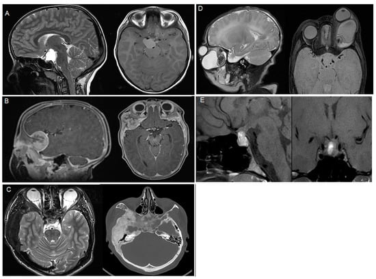 - Ballestero, M.F.M.; de Souza, S.N.F.; Neto, R.C.P.; Gondim, G.G.P.; Valera, E.T.; dos Reis, M.B.F.; Colli, B.O.; de Oliveira, R.S. Pediatric skull base tumors: A management challenge. J. Pediatr. Neurosci. 2021, 16, 35–43. [Google Scholar] [CrossRef]