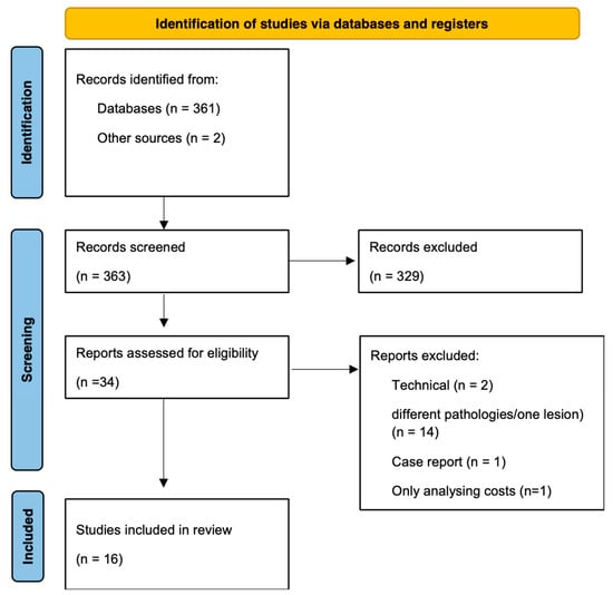 We identified 363 reports based on the initial search string. After the initial exclusion of reports based on their titles, 34 abstracts were reviewed, resulting in 16 reports with a total of 790 patients, which were included based on the full-text review (Figure 2). An overview of the included studies is shown in Table 3. Seven studies included solely open approaches or endoscopic approaches, while two studies included open and endoscopic approaches [,,,,,,,,,,,,,,,]. The mean age of the patients included in the 16 studies was 10.97 years (95% CI [10.8, 11.1]) with 435 (55.1%) male patients. Mean follow-up time amongst all studies was 37.73 (95% CI [36.2, 39.2]) months. The most common pathology described was craniopharyngioma (n = 142, 17.9%, Table 3).