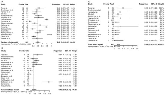 Weighted incidence rate of (A) transient complications, (B) permanent complications, and (C) mortality among all included studies for the review. [,,,,,,,,,,,,,,,,].