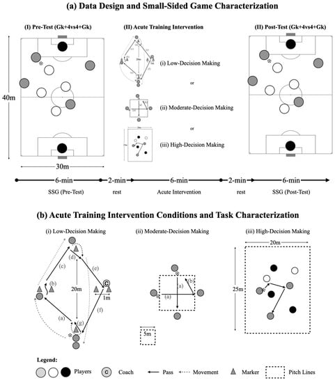 On all days, the sessions began with a standardised 15 min warm-up consisting of mobility-based movements and a possession game (4 vs. 4 without goals). Following the warm-up, the players were allocated to one of the pitches (Pitch 1, Team A vs. Team B; Pitch 2, Team C vs. Team D) to perform a Gk + 4 vs. 4 + Gk SSG using official 7-a-side goals on a 40 × 30 m artificial turf pitch (length × width ratio = 1.33). The game lasted for 4 min and was used to assess the players’ performance prior to the training intervention (pre-test). Several official-sized footballs were placed near the pitch’s external lines to guarantee the ball’s fast replacement, decreasing the time spent out of play. No coach feedback or encouragement was allowed during the pre- and post-test SSGs (i.e., during the game situations used to measure the players’ performance, so as not to affect the players’ performance). The SSG was performed according to the official FIFA rules on an outdoor artificial turf pitch, with the following exceptions: (i) the game restarted by the corresponding goalkeeper when a goal was scored or when the ball left the pitch by the end line, allowing a faster restart; and (ii) no offside rule was applied. After the pre-test, the players had a 2 min rest period, in which they were encouraged to drink water, followed by the 6 min intervention tasks (Low, Mod, and High DM) in a random order set using random.org. Lastly, the SSG was repeated 2 min after the intervention to inspect how the intervention acutely impacted the players’ performance (post-test) (Figure 1a).