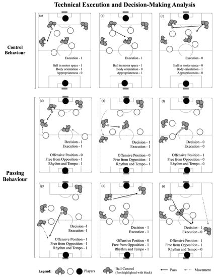 From the passing behaviour, the following technical criteria were used: (i) free from opposition, which is the player’s ability to pass the ball to a teammate who is not closely marked by the opposition (e.g., see Figure 2g for a proper passing situation, and Figure 2f for a pass to a marked teammate); (ii) offensive position, which is the players’ ability to perform passes that allow progress on the field (for example, Figure 2h reflects a situation in which there were more offensive solutions than the selected pass); and (iii) rhythm and tempo, which reflect the players’ ability to pass the ball with proper speed and direction (see Figure 2i,h for examples). These criteria were created to complement the information from the GPET measures, which decompose the skills into more specific and contextual information. Following the data collection and one week later, 10% of the sample was retested, and the values varied from 0.89 to 0.84 for both the ball control and passing behaviours (i.e., high intraclass correlation) [45].