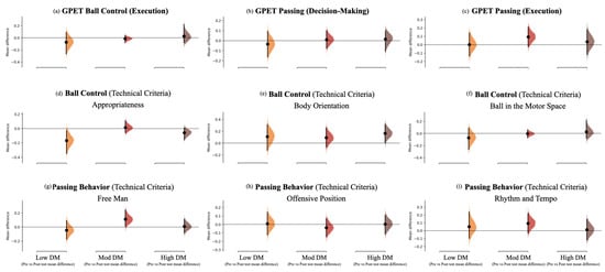 Mean changes are depicted in Figure 3 and Figure 4. For example, from the GPET perspective (Figure 3a–c), the High DM task revealed improvements in the mean values for all variables, while the Mod DM task only showed improvements for passing behaviour, and the Low DM task revealed decrements for ball control and passing decision-making.