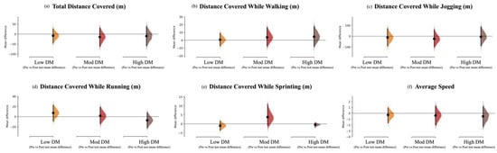 The mean difference (each mean difference is plotted as a bootstrap sampling distribution) for three comparisons pre- and post-measurements according to (i) total distance covered, (ii) distance covered while walking, (iii) distance covered while jogging, (iv) distance covered while running, (v) distance covered while sprinting, and (vi) average speed for the Low DM, Mod DM, and High DM tasks, as shown in the Cumming estimation plots above. Mean differences are depicted as dots; 95% CIs are indicated by the ends of the vertical error bars [50].